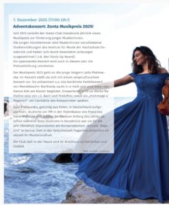 Unser diesjähriges Konzert fand am 7. Dezember 2025  unter dem Titel  „Kultur am Gertrudenberg, Sonntagskonzerte“, 2. Halbjahr, statt. Zahlreiche Gäste bewunderten das virtuose Violinkonzert der jungen Preisträgerin. Herzlichen Glückwunsch, Julia!